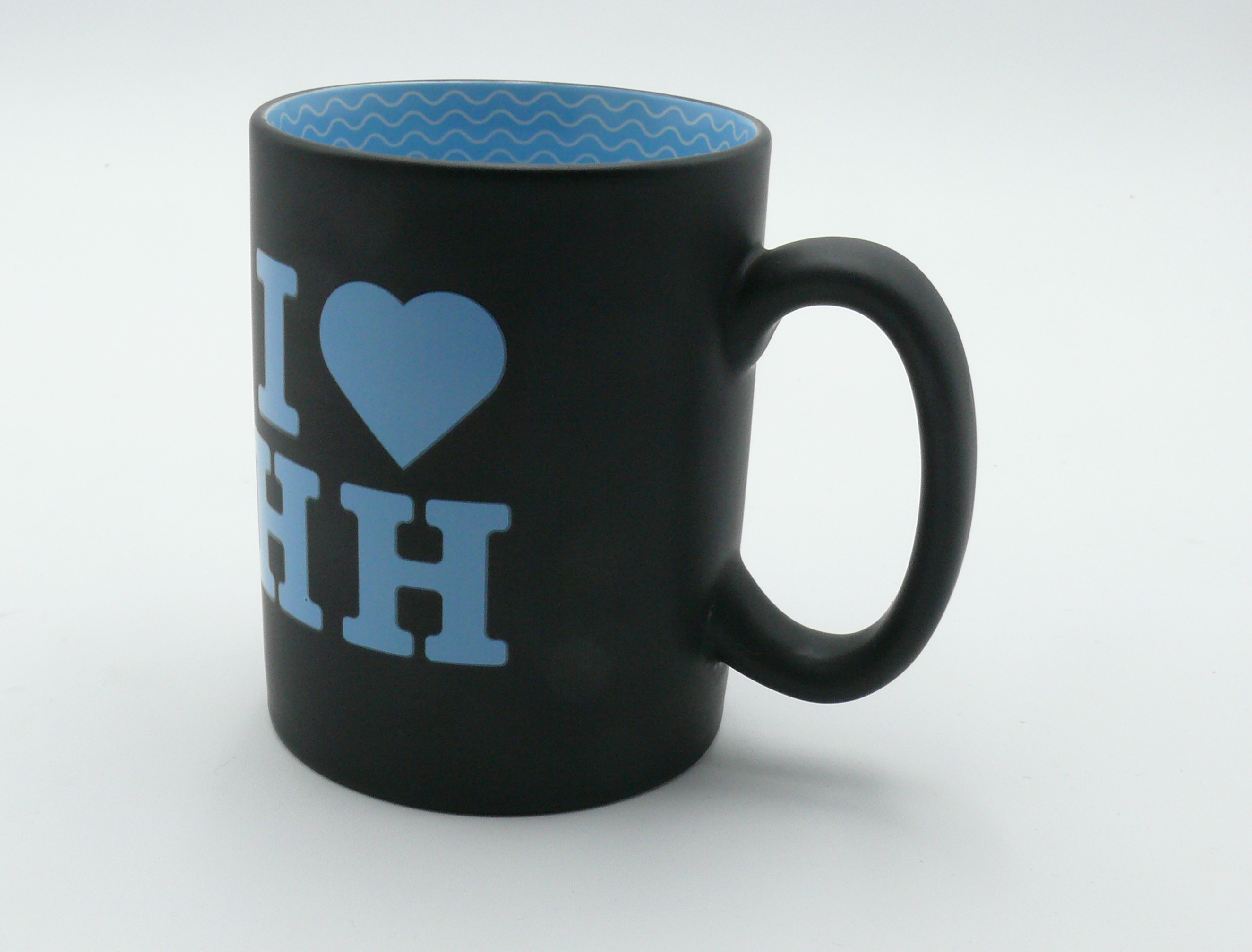 Ein großer Becher. Außen schwarz matt mit dem hellblauen Schriftzug "I (Herz) HH"