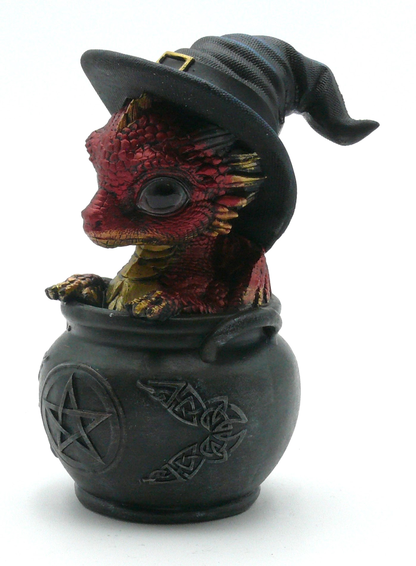 Dieser kleine Drache schaut mürrisch aus seinem Kessel raus. Ist ein Zauberspruch schief gelaufen oder ist er einfach nur hineingefallen?