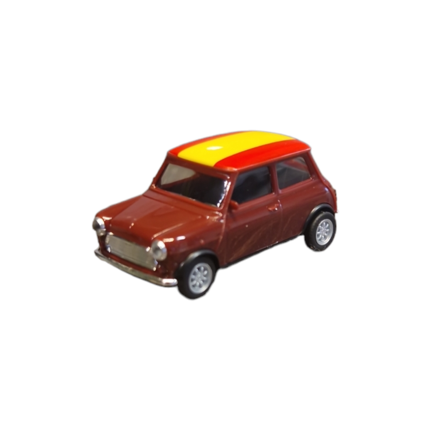 Lizensiertes H0 1:87 Modellfahrzeug Mini Cooper mit Spanien Flagge auf dem Dach.