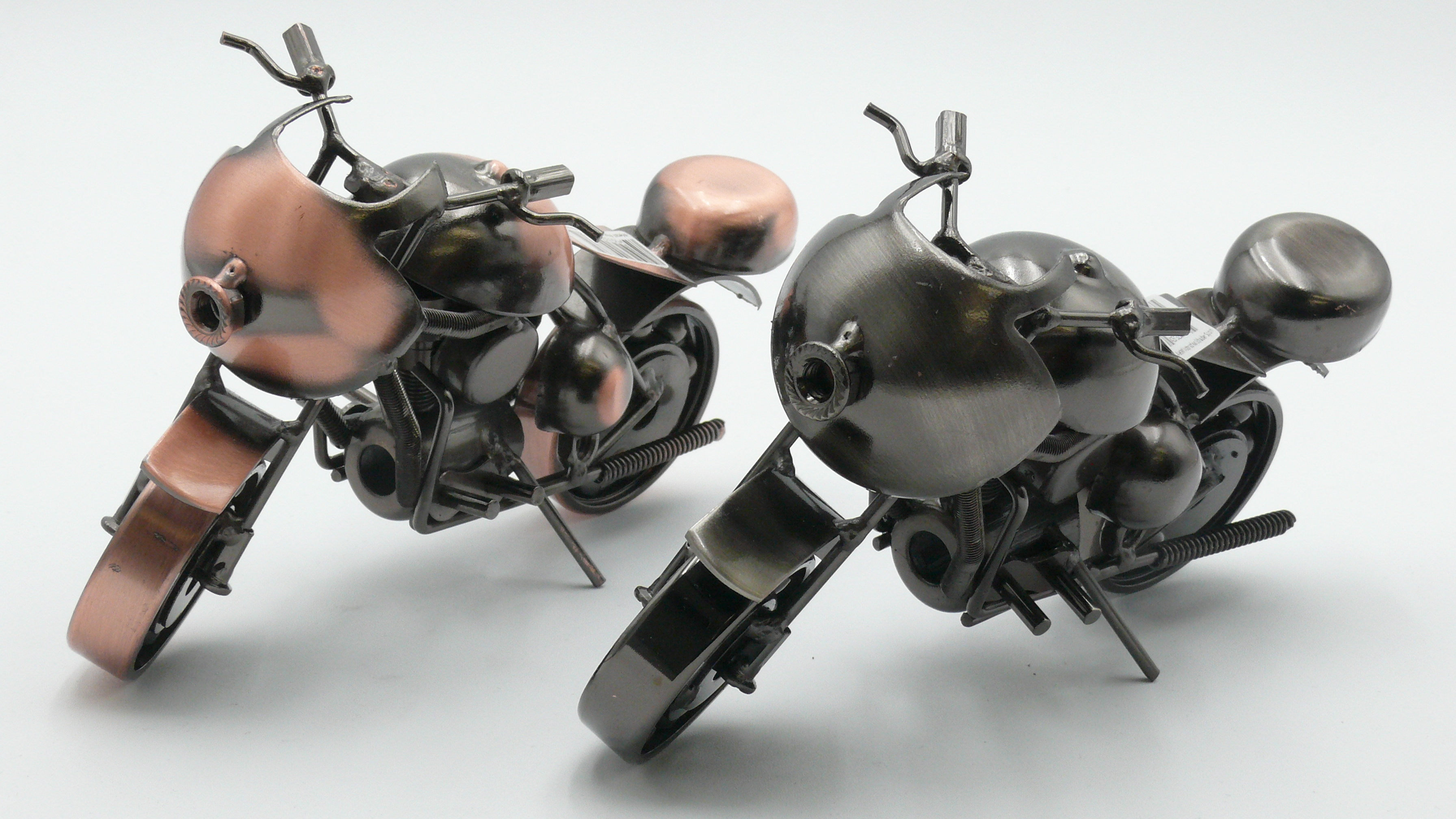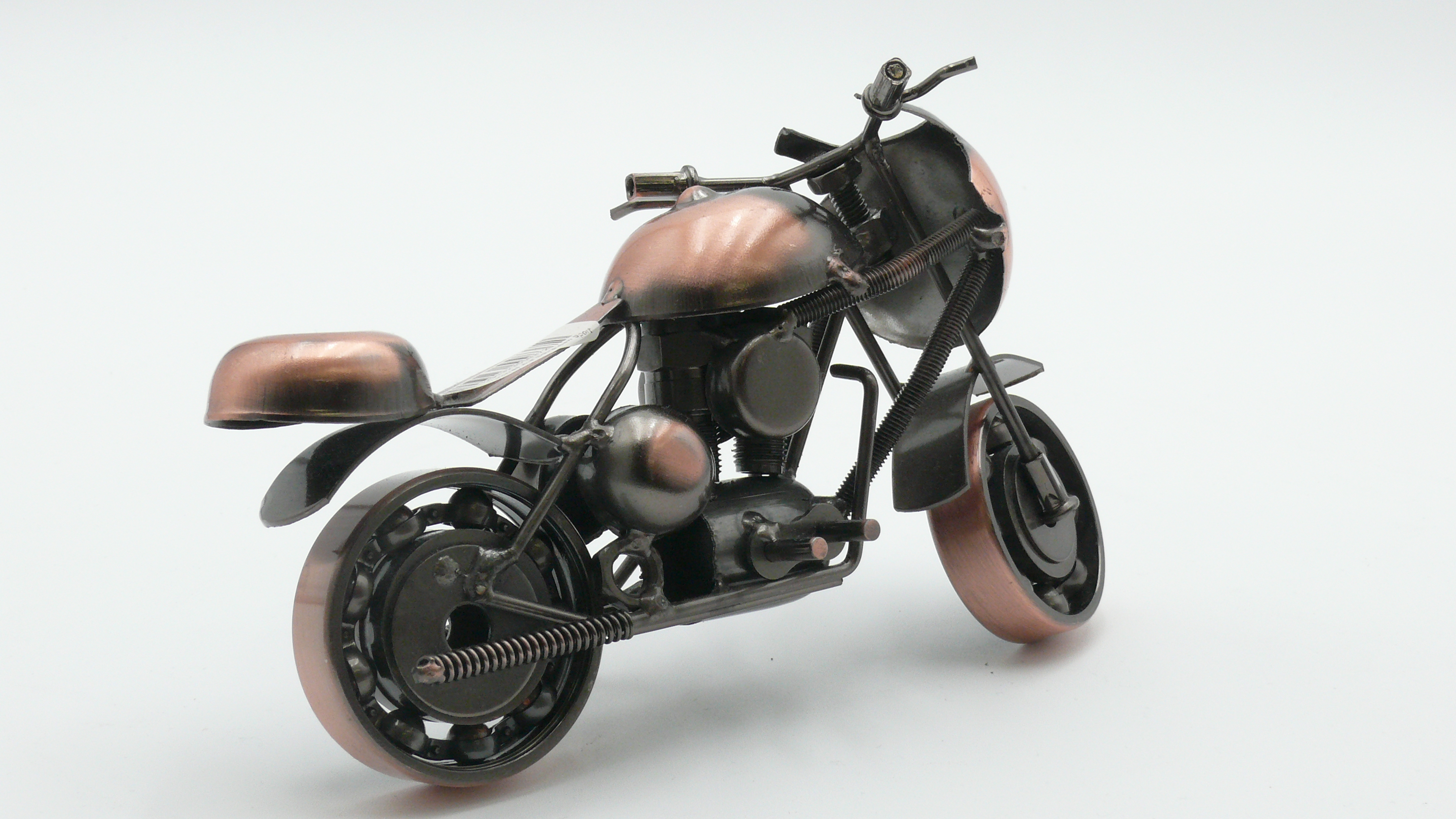 Dieses dekorative Deko-Motorrad ist aus diversen Metallteilen zusammengesetzt, die verschiedene Tile des realen Motorrads nachahmen. So sind die Scheinwerfer Muttern, Schlauchleitungen aus Metallfedern und die Reifen aus Kettenglieder.