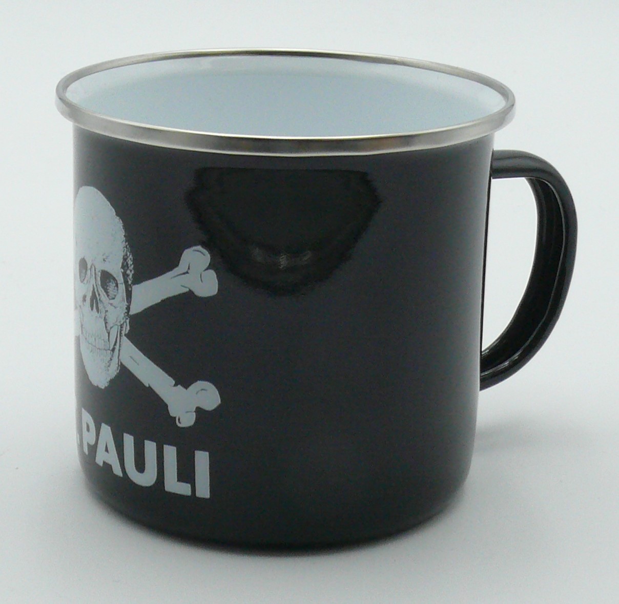 In Schwarz mit dem typischen St.Pauli Totenkopf in weiß.
