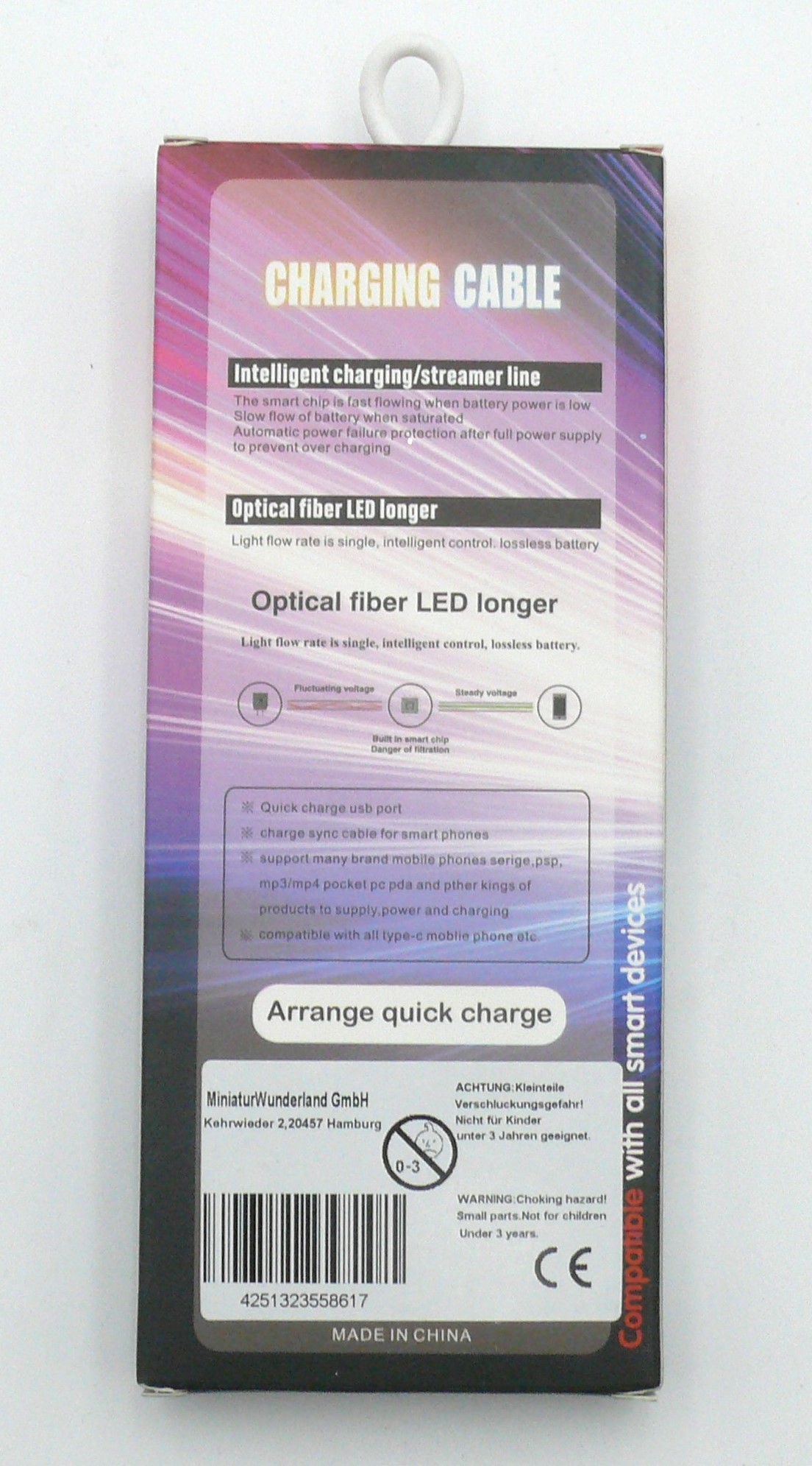 Auf der anderen Seite ist ein Micro-USB Anschluss vorhanden, so dass die viele Geräte mit diesem Kabel geladen werden können.